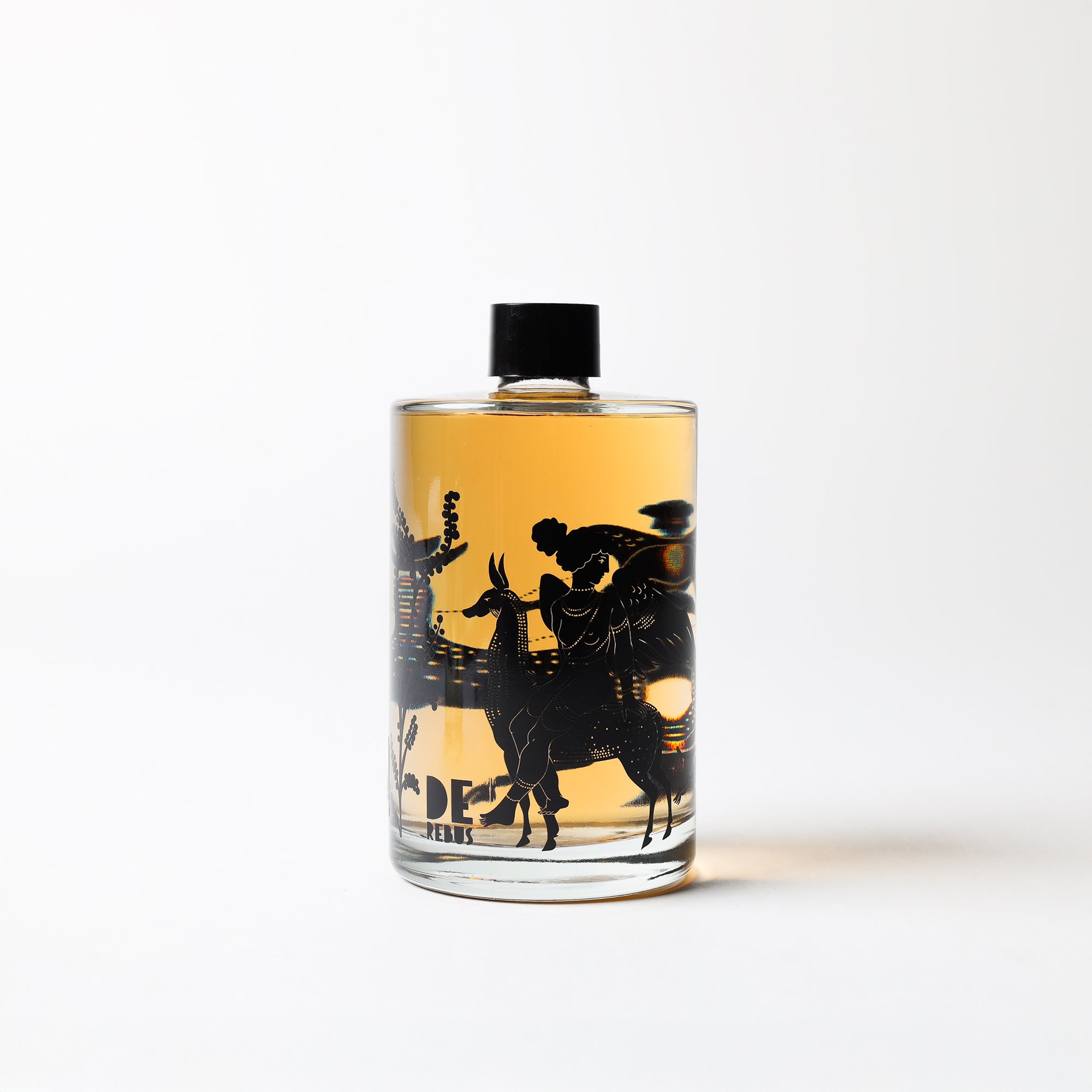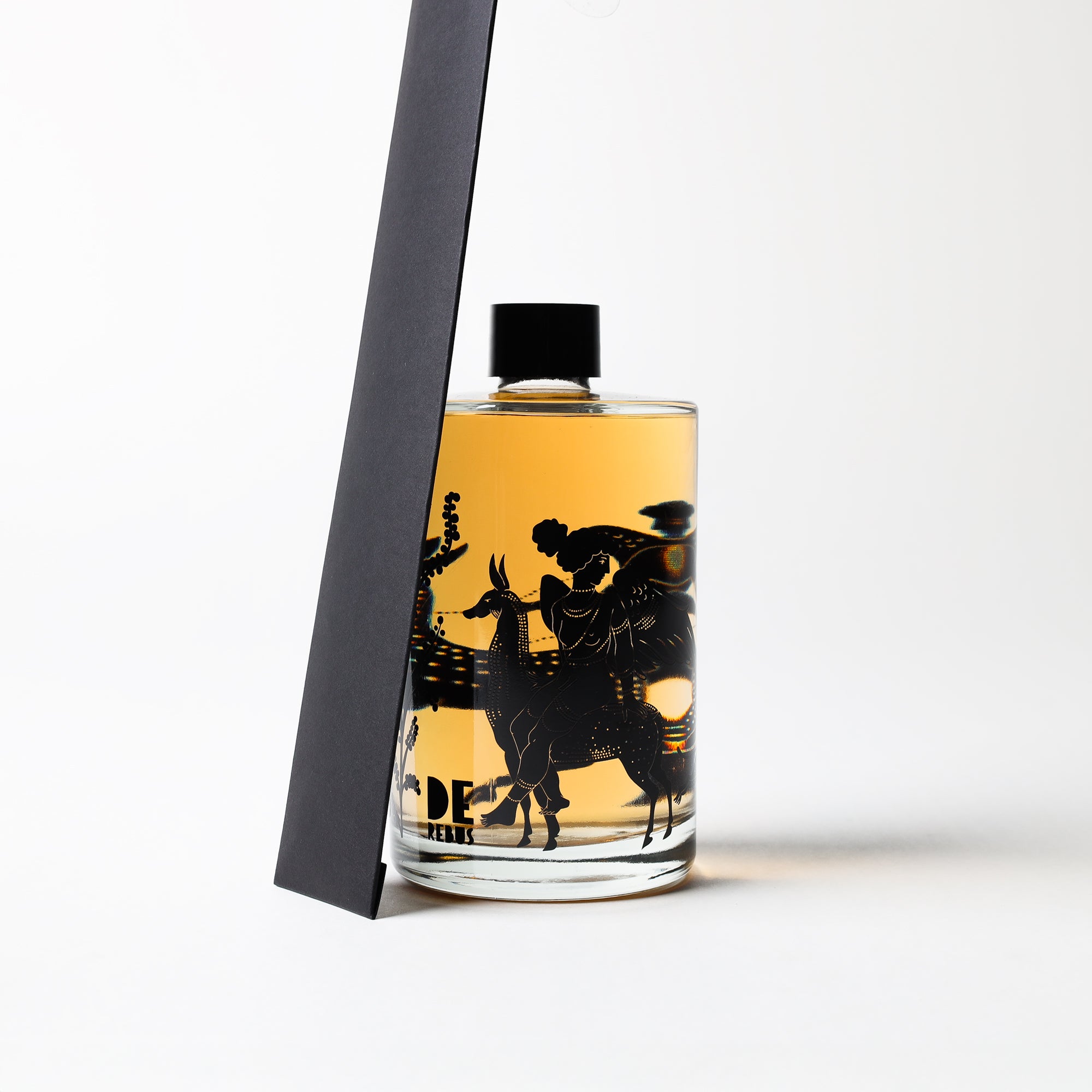 Hand-filled fragrance diffuser in clear glass featuring black graphic artwork applied using Italian decal technique.