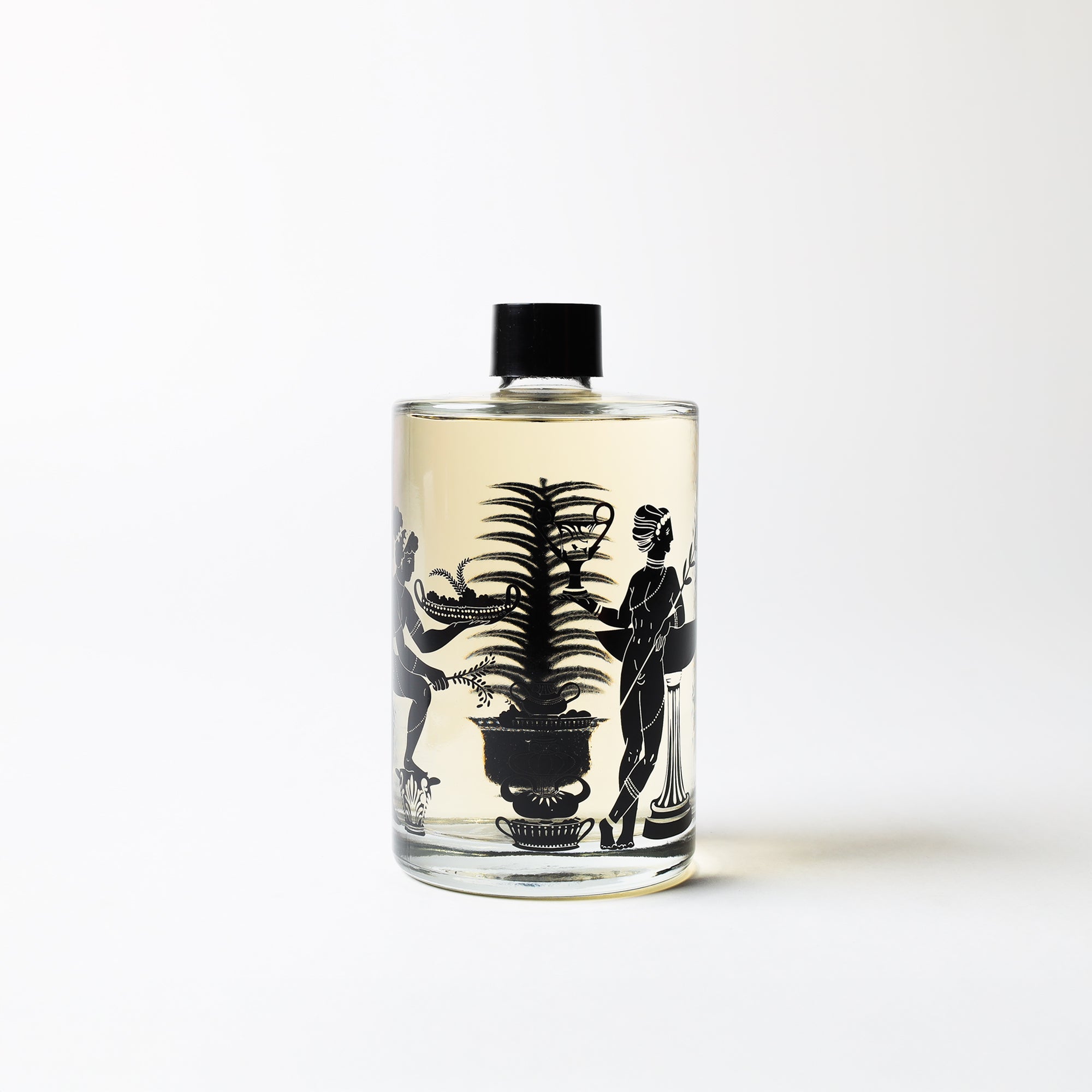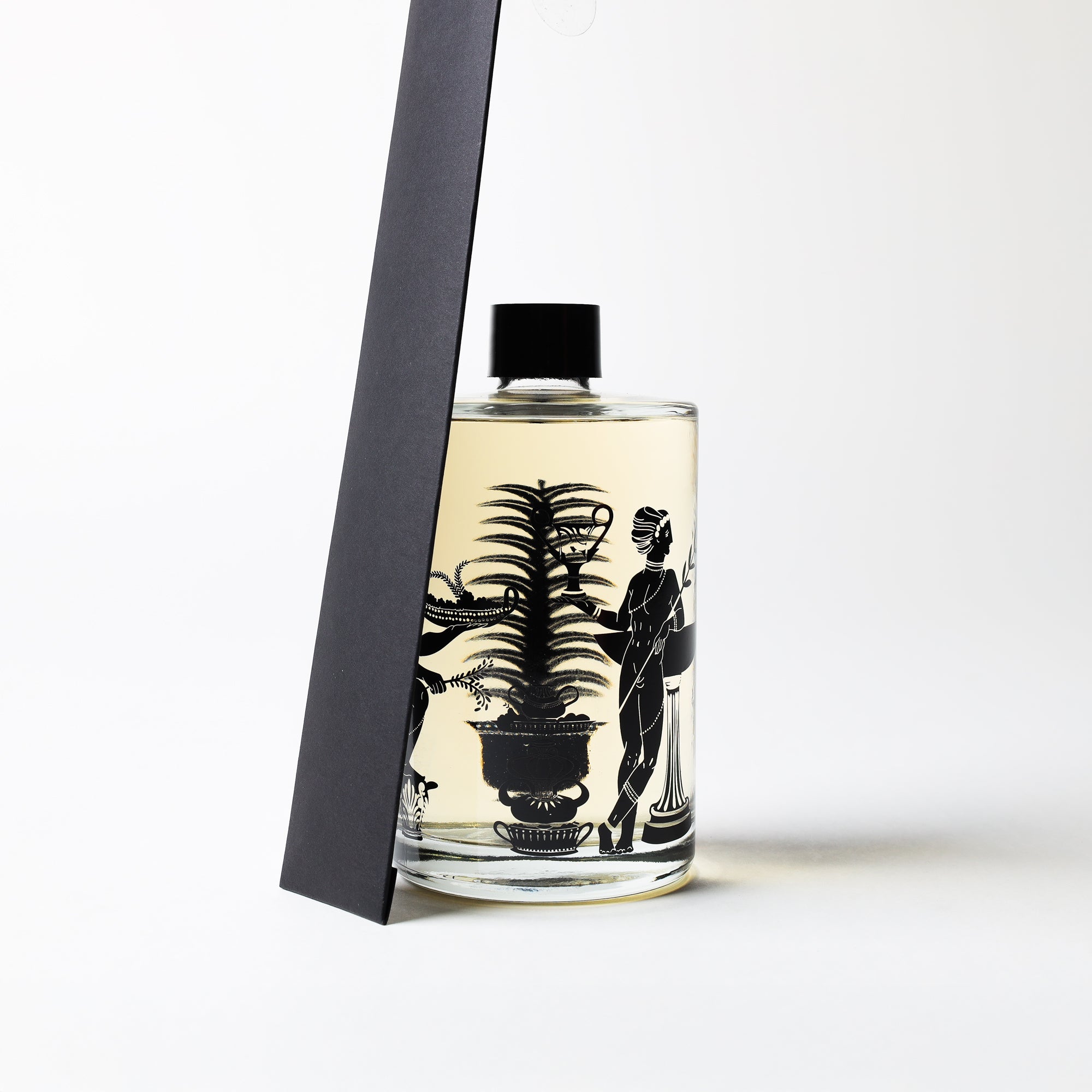 Hand-filled fragrance diffuser in clear glass featuring black graphic artwork applied using Italian decal technique.