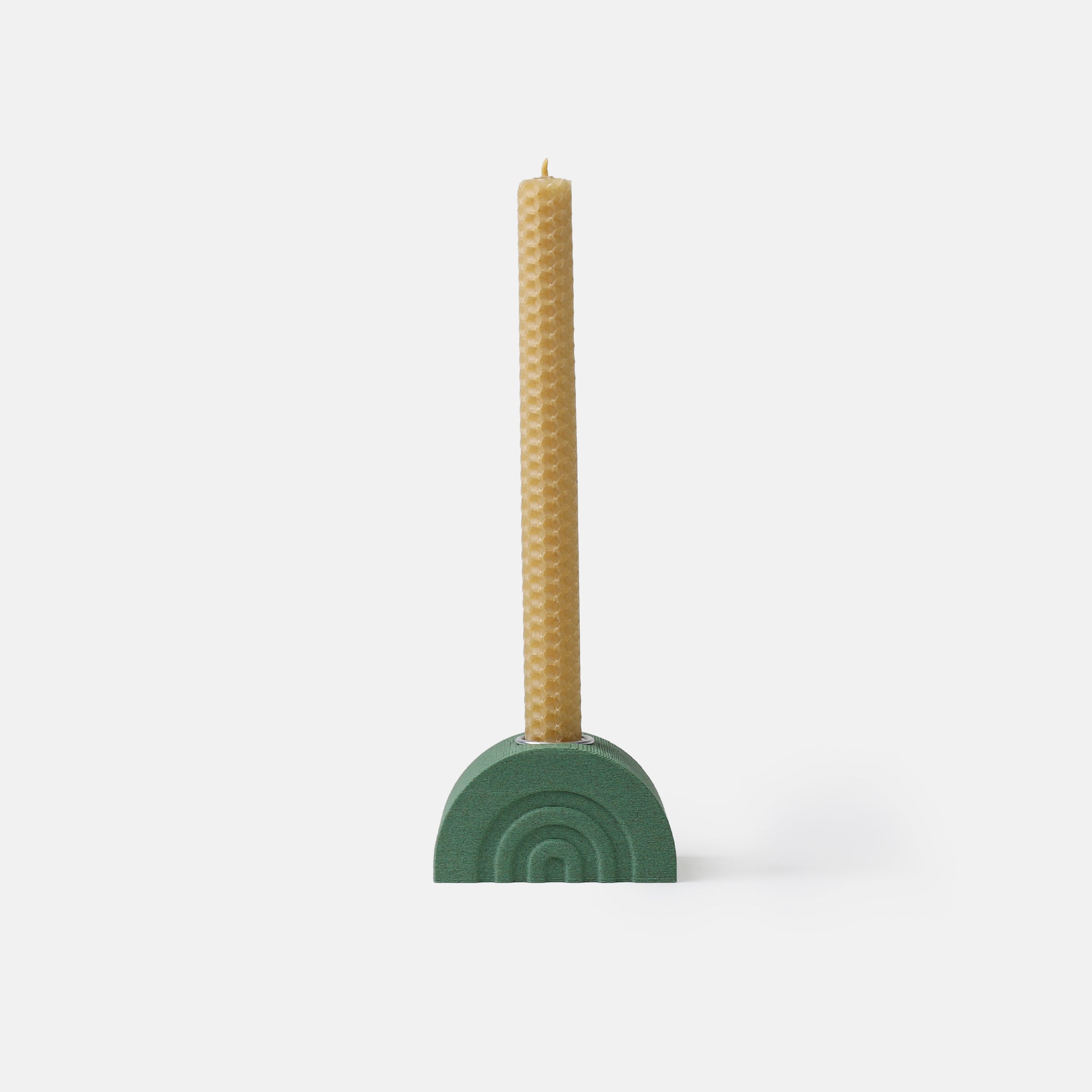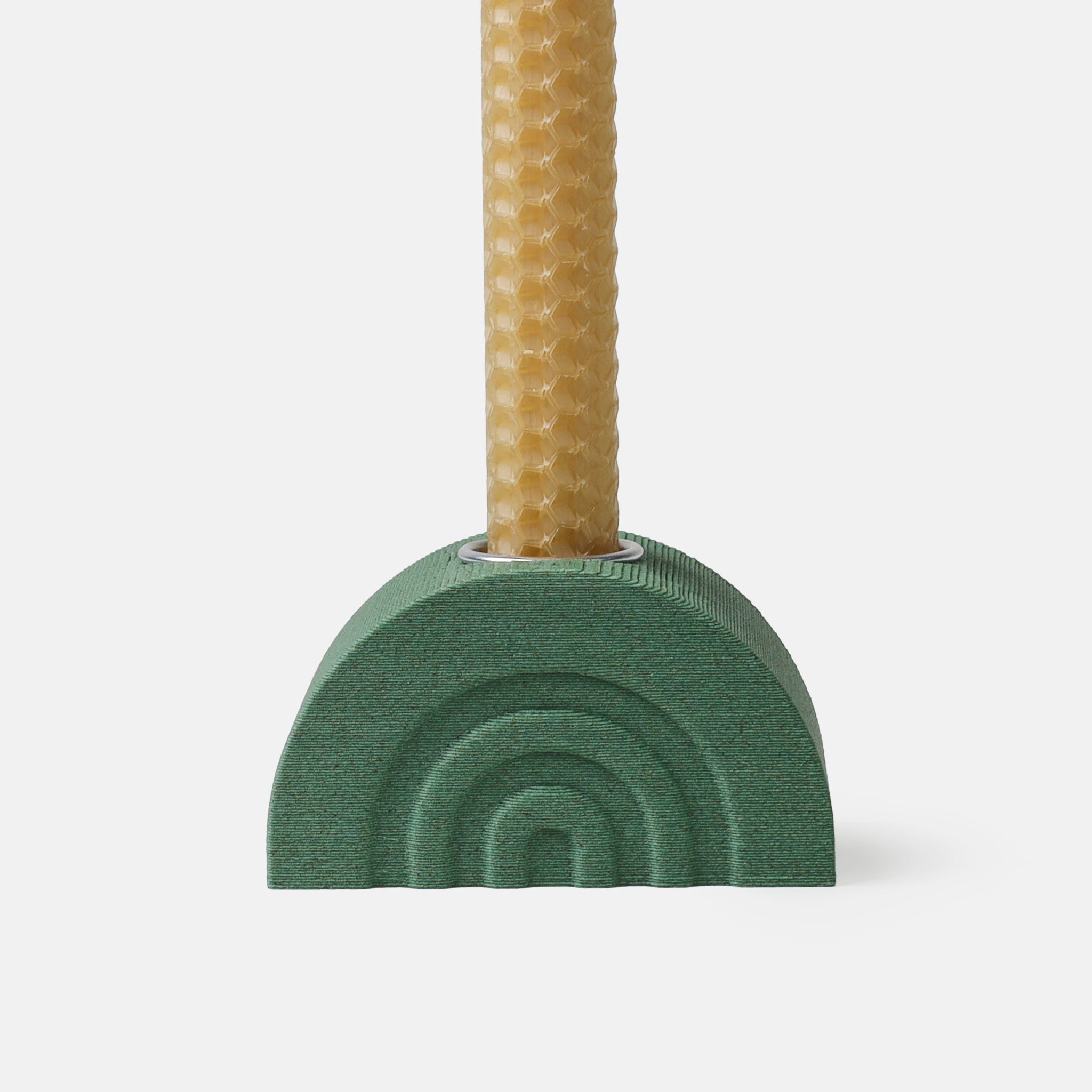 Eco-friendly 3D-printed candle holder with a wood-like texture and rainbow design.